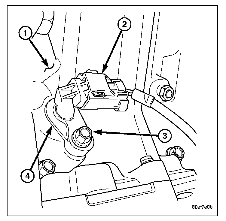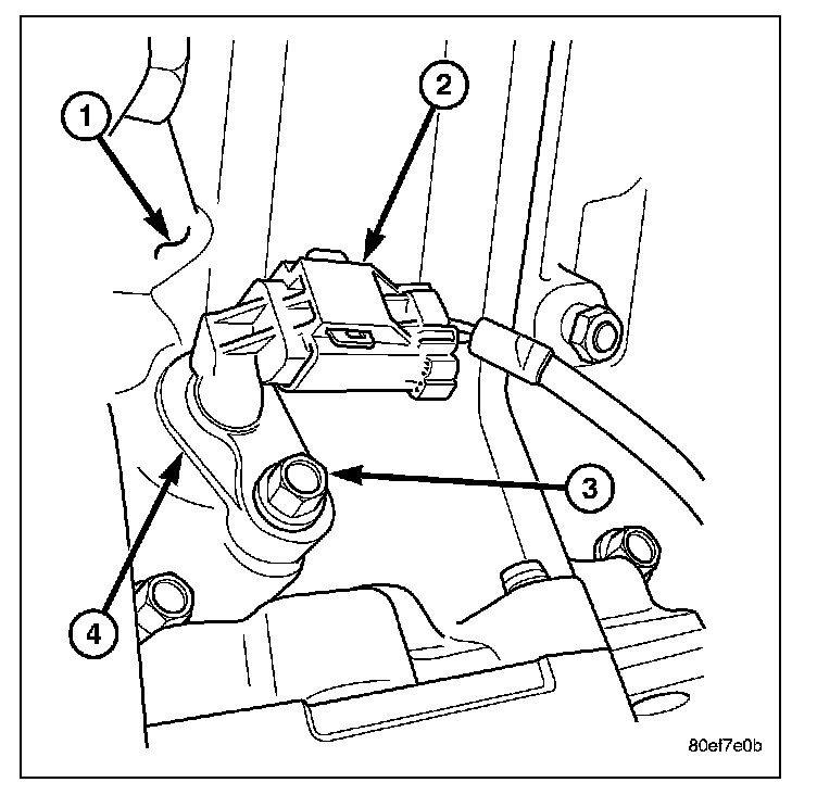 The Crankshaft Position (CKP) sensor (4) is located at the right-rear side of the engine cylinder block (1). It is positioned and bolted into a machined hole in the engine block.