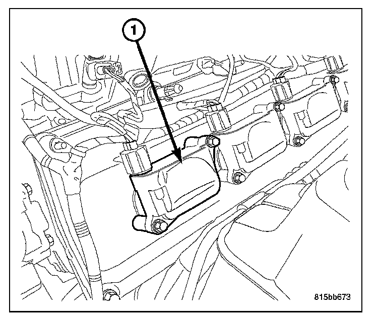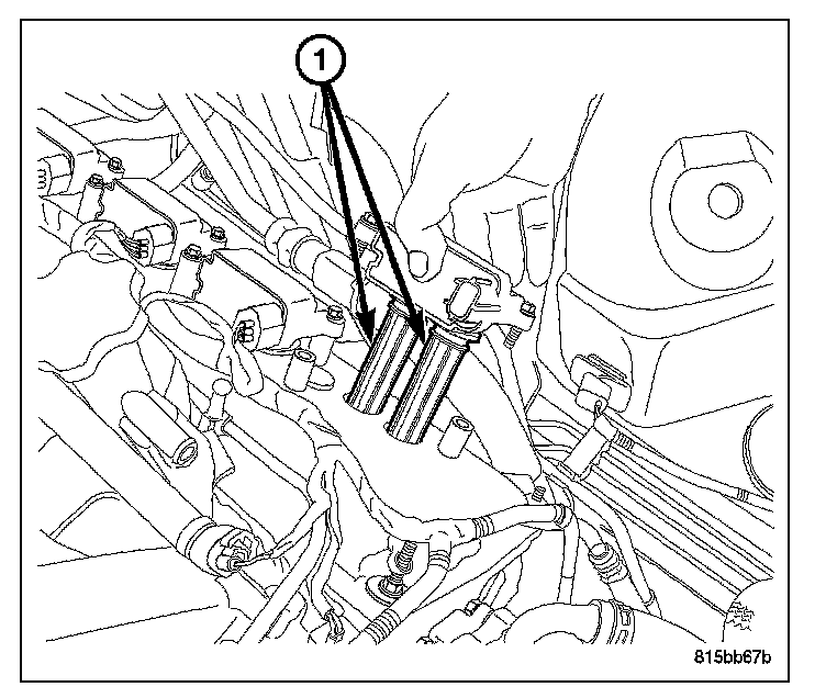 A separate ignition coil (1), mounted to the valve cover is used for each cylinder. Each coil fires the two spark plugs at times predetermined by the Powertrain Control Module (PCM).