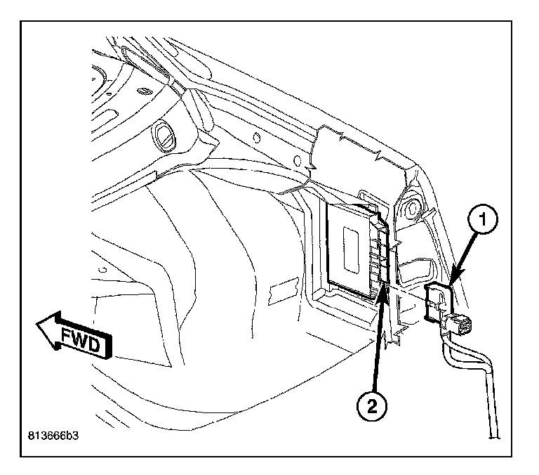 2. Position the Park Assist Module (2) and install the two attaching screws (1). Torque screws to 3.5 N.m (30 in.lbs.).