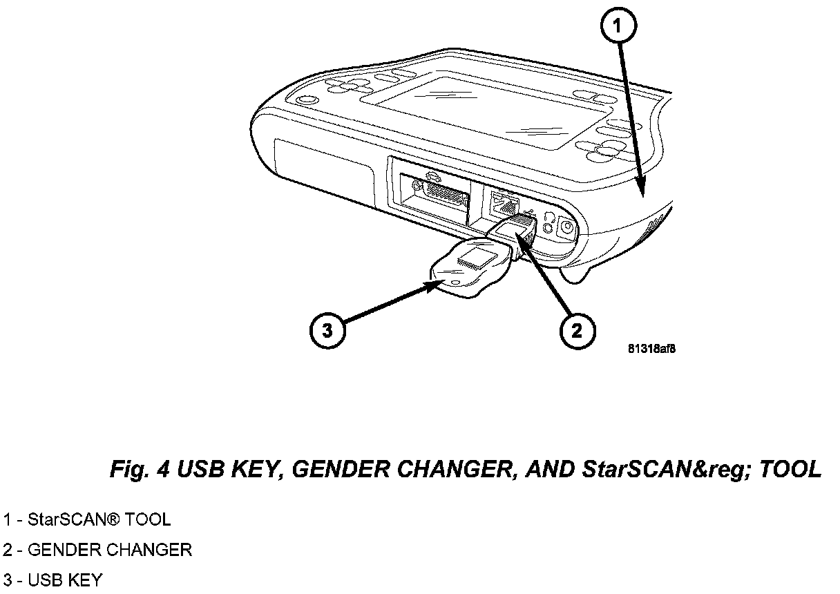 10. With the StarSCAN(R) powered OFF, connect the USB Key and Gender Changer to the StarSCAN(R) USB port (Fig. 4).