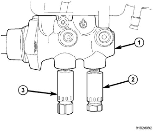 1. Install the proportioning valve (2 or 3) in its master cylinder (1) port. Tighten the proportioning valve to 30 Nm (22 ft. lbs.).