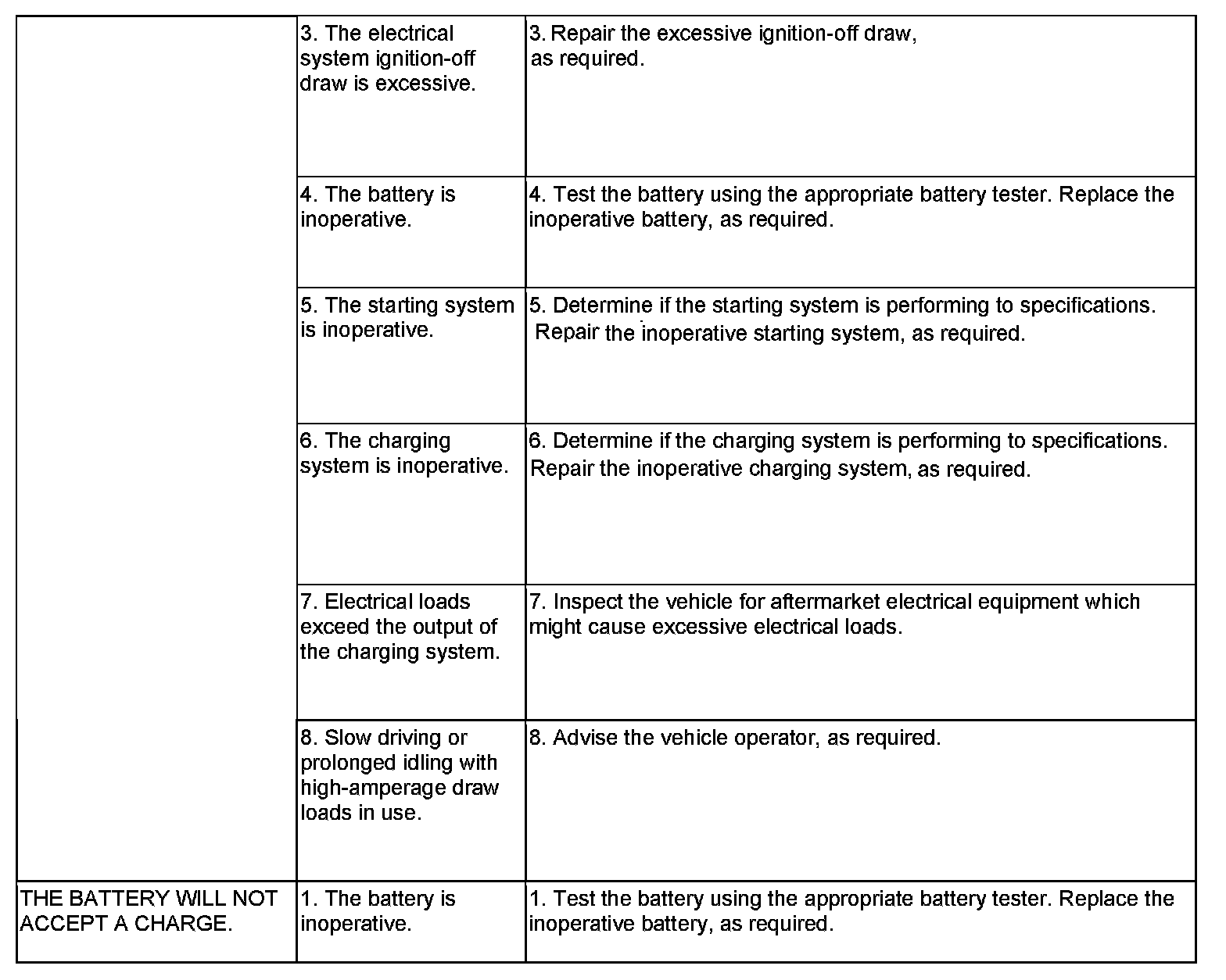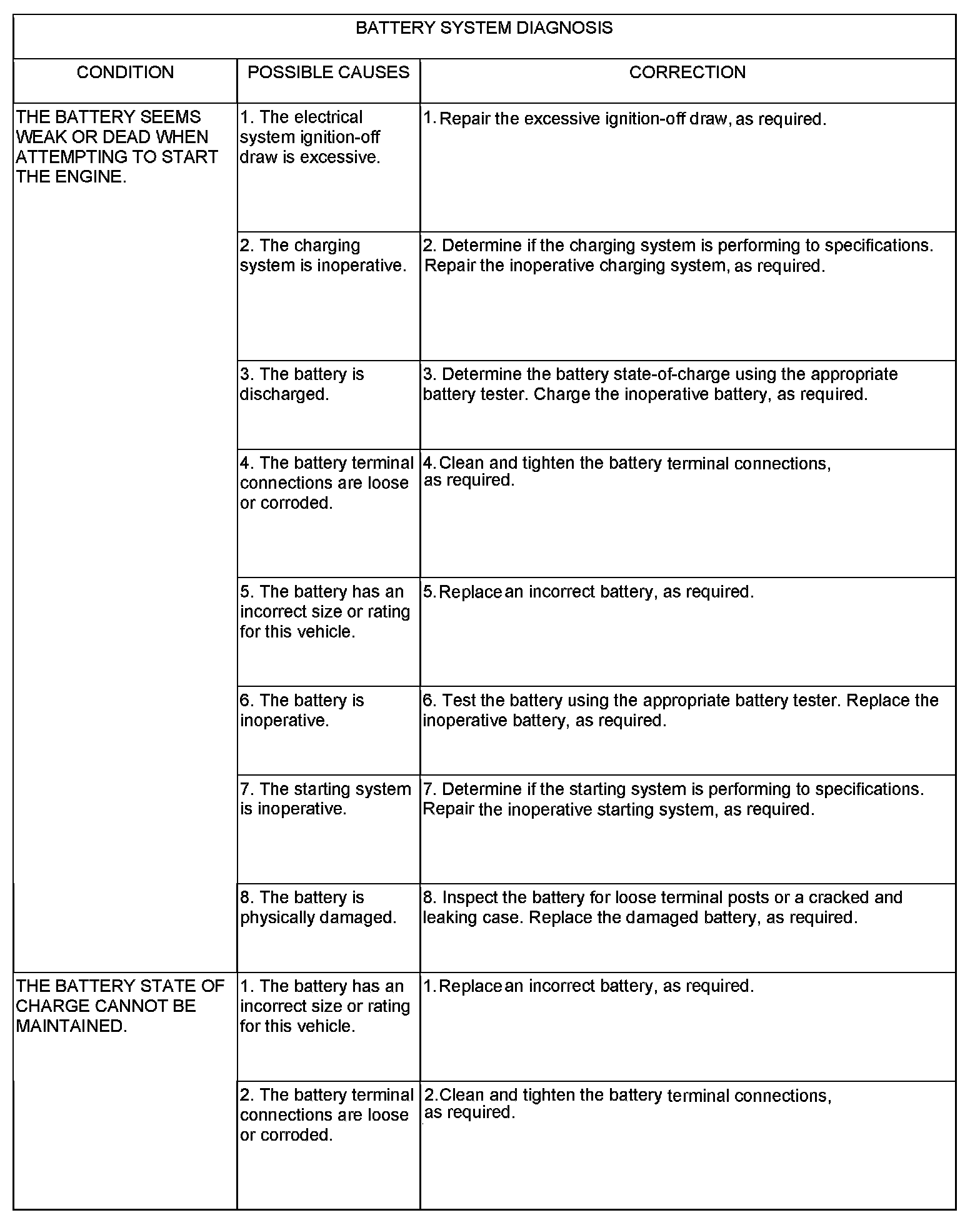 The battery, starting, and charging systems in the vehicle operate with one another and must be tested as a complete system. In order for the engine to start and the battery to maintain its charge properly, all of the components that are used in these systems must perform within specifications. It is important that the battery, starting, and charging systems be thoroughly tested and inspected any time a battery needs to be charged or replaced. The cause of abnormal battery discharge, overcharging or early battery failure must be diagnosed and corrected before a battery is replaced and before a vehicle is returned to service. The service information for these systems has been separated to make it easier to locate the specific information you are seeking. However, when attempting to diagnose any of these systems, it is important that you keep their interdependency in mind.