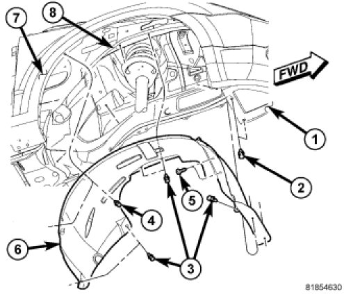 Raise splash shield (5) up to wheel house and align with holes in quarter panel (6).