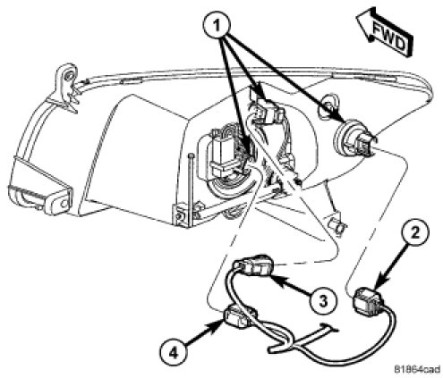 2. Connect the two front lamp unit electrical connectors (2 and 3).