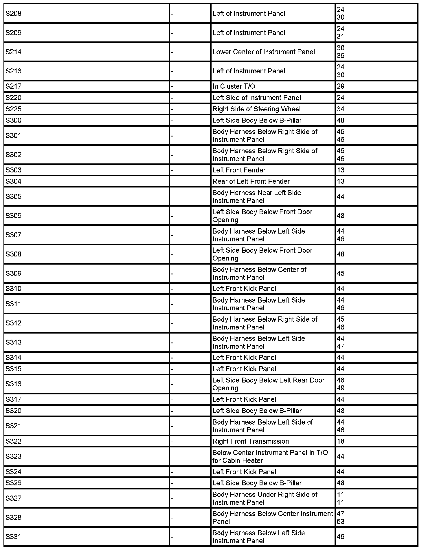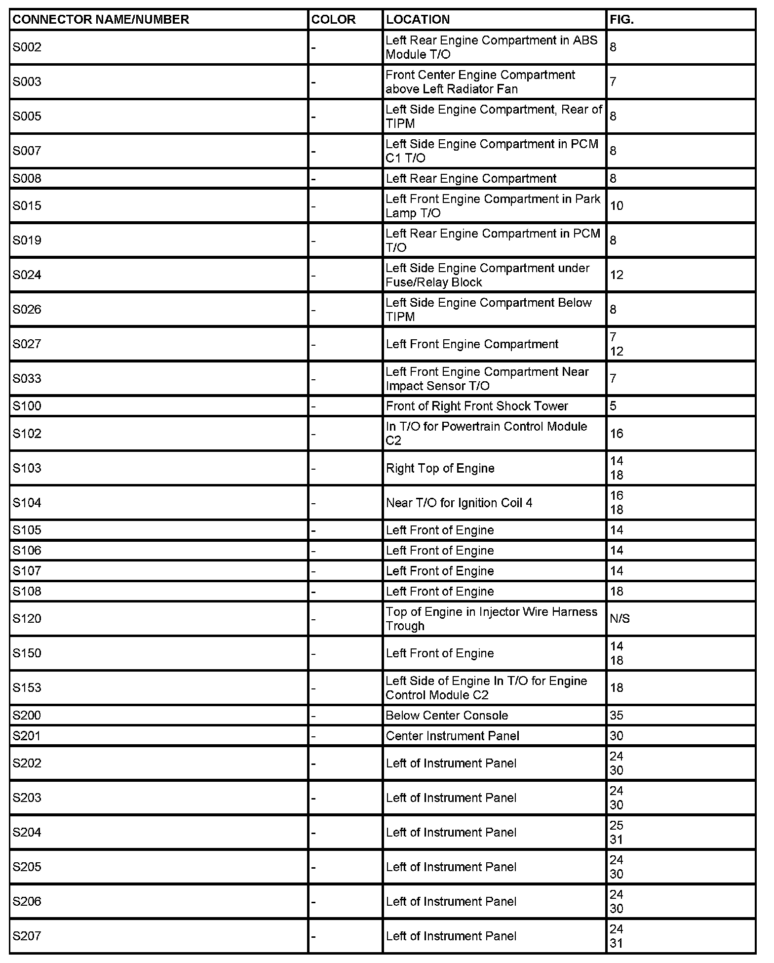 The abbreviation T/O (Take Out) is used in the location column to indicate a point in which the wiring harness branches out to a component.