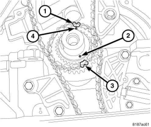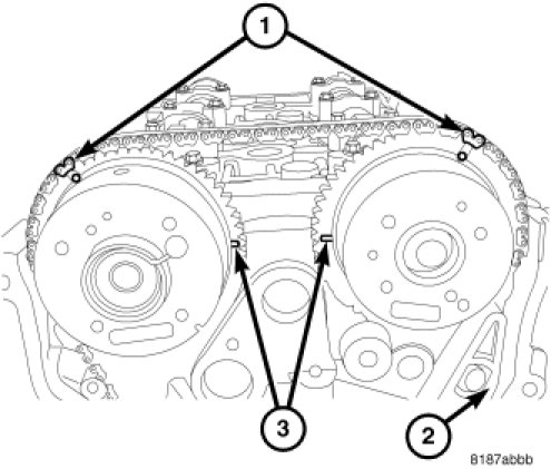 ^ Align timing mark on the crankshaft sprocket (2) with the plated link (3) on the timing chain. Position chain so slack will be on the tensioner side.