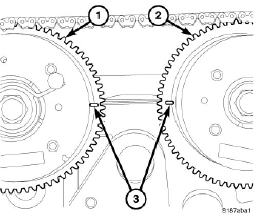 ^ Install timing chain so plated links on chain align with timing marks on camshaft sprockets (1).
