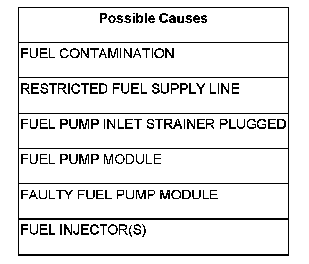 Remove the Fuel Pump Module and Fuel Tank Module (if equipped), inspect the Fuel Pump Inlet and the bottom of the fuel tank for debris that could cause the fuel pump inlet to be plugged.