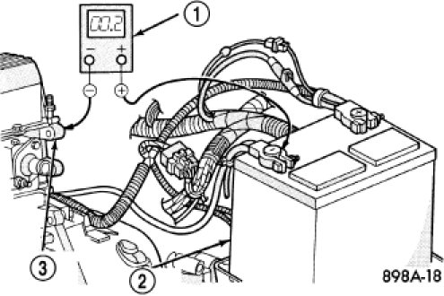 4. Connect the voltmeter (1) to measure between the battery (2) negative cable terminal clamp and a good clean ground on the engine block (3). Rotate and hold the ignition switch in the Start position. Observe the voltmeter. If the reading is above 0.2 volt, clean and tighten the battery negative cable eyelet terminal connection to the engine block. Repeat the test. If the reading is still above 0.2 volt, replace the faulty battery negative cable.