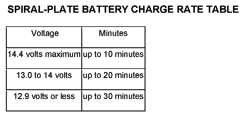 3. Battery chargers vary in the amount of voltage and current they provide. The amount of time required for a battery to accept measurable charging current at various voltages is shown in the Charge Rate Table. If the charging current is still not measurable at the end of the charging time, the battery is faulty and must be replaced. If the charging current is measurable during the charging time, the battery may be good and the charging should be completed in the normal manner.