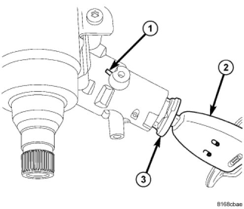 2. Align the ignition module with the pin (3), actuator shaft and retaining tabs (2) located on the lock cylinder housing. Carefully install the module, snapping it into place over the retaining tabs.