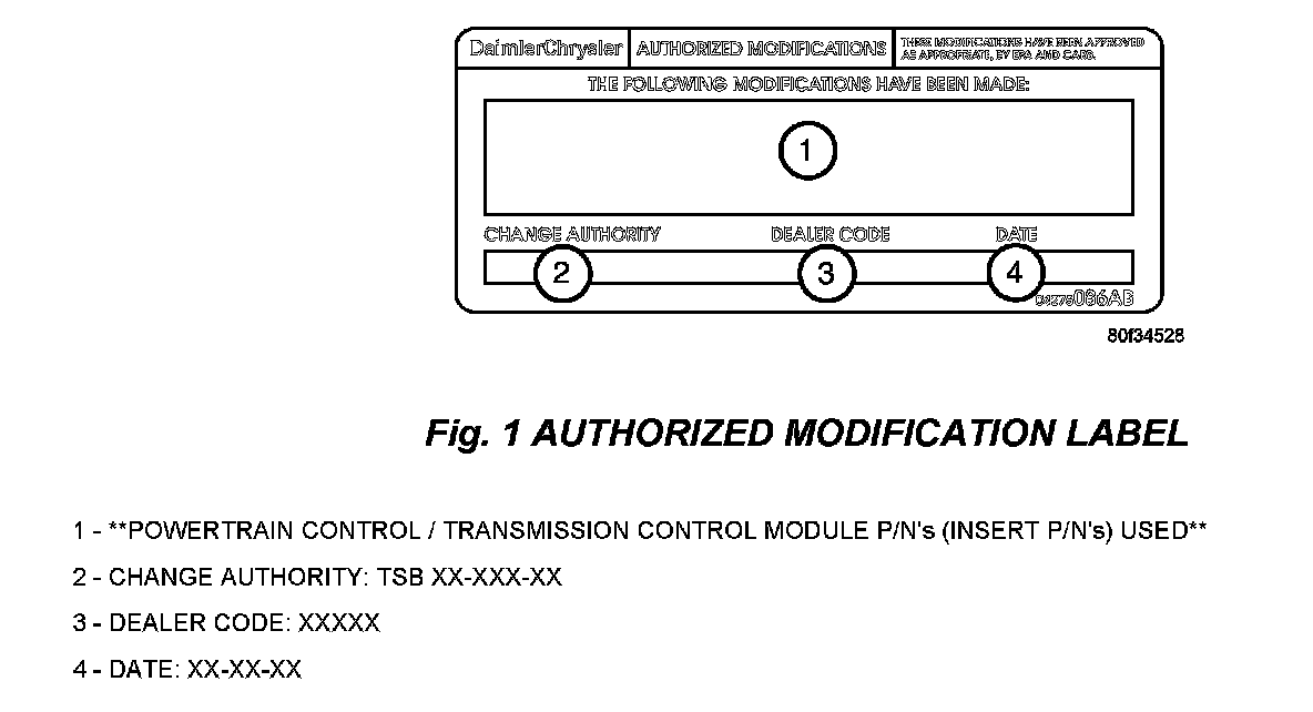 9. Type the necessary information on the "Authorized Modification Label p/n 04275086AB and attach near the VECI label (Fig.1).