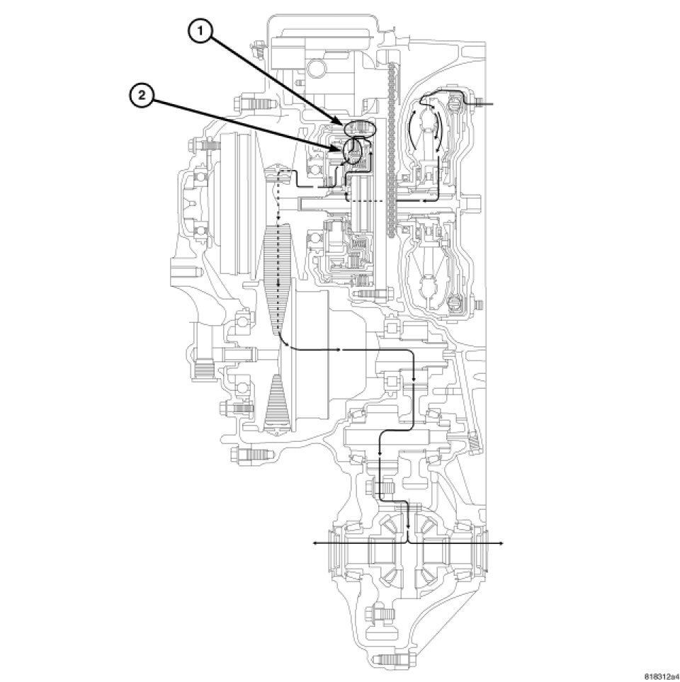The pulley ratio linkage moves to the right direction in the stepper motor. As the ratio control valve which links to the pulley ratio linkage, moves fluid and the primary pulley is drained.