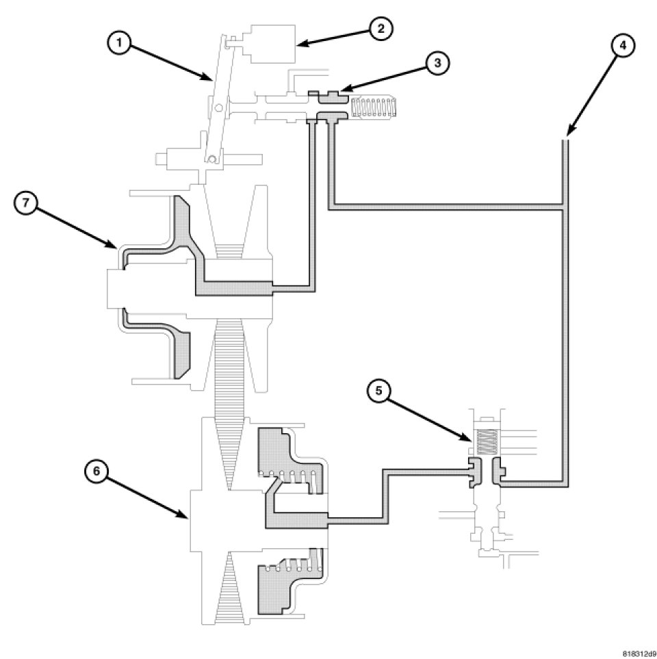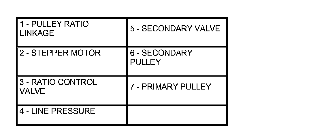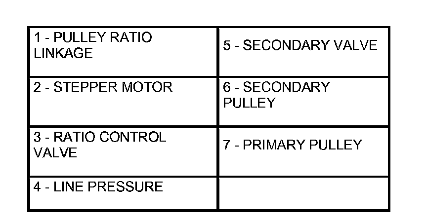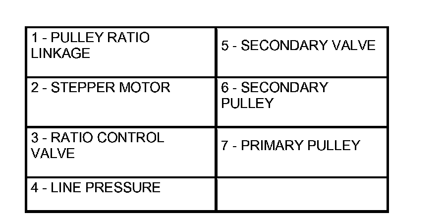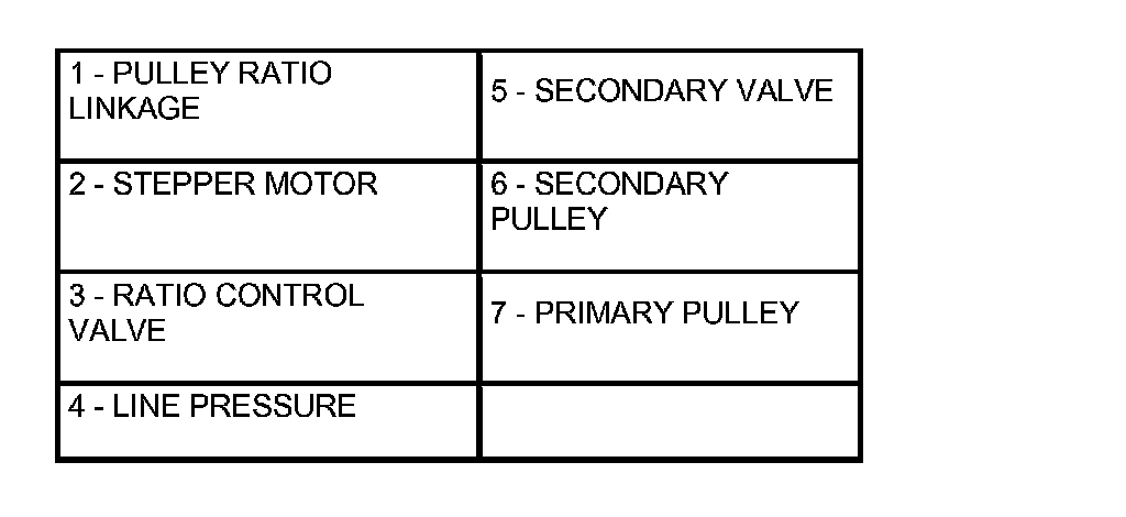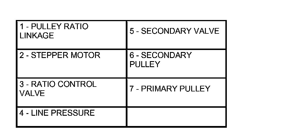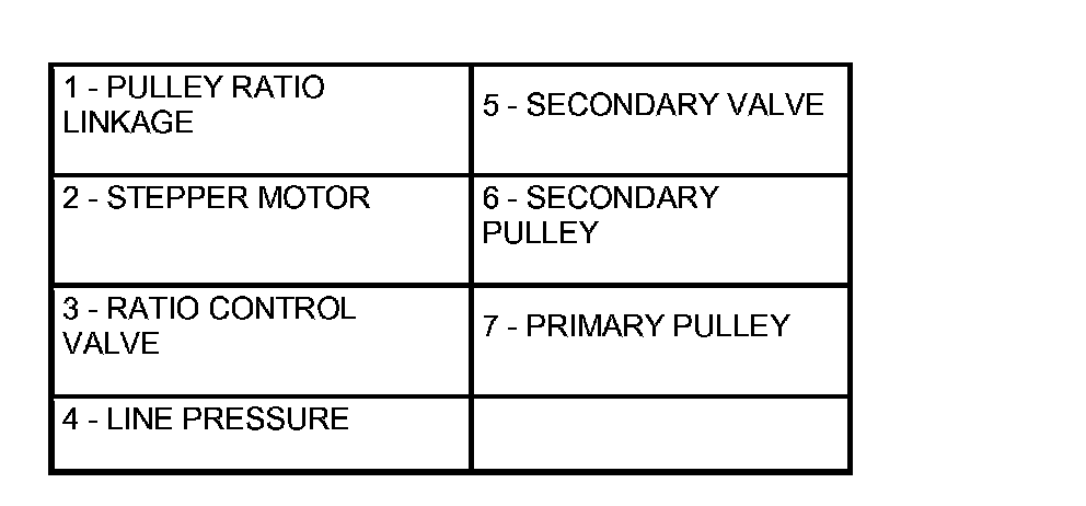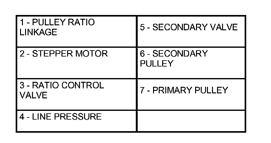 The pulley ratio linkage moves to the left direction of the stepper motor. The line pressure circuit opens due to the movement of the ratio control valve which links to the pulley linkage, and line pressure is applied to the primary pulley.