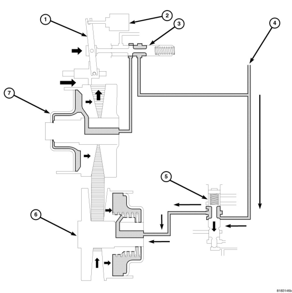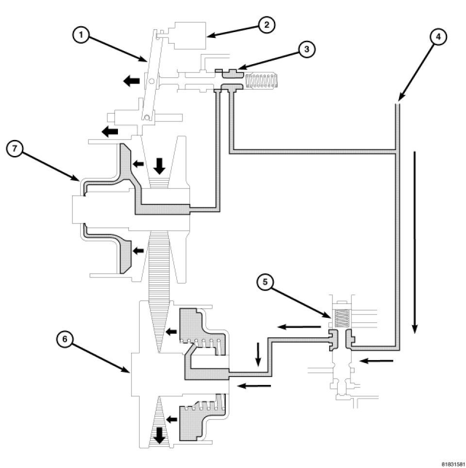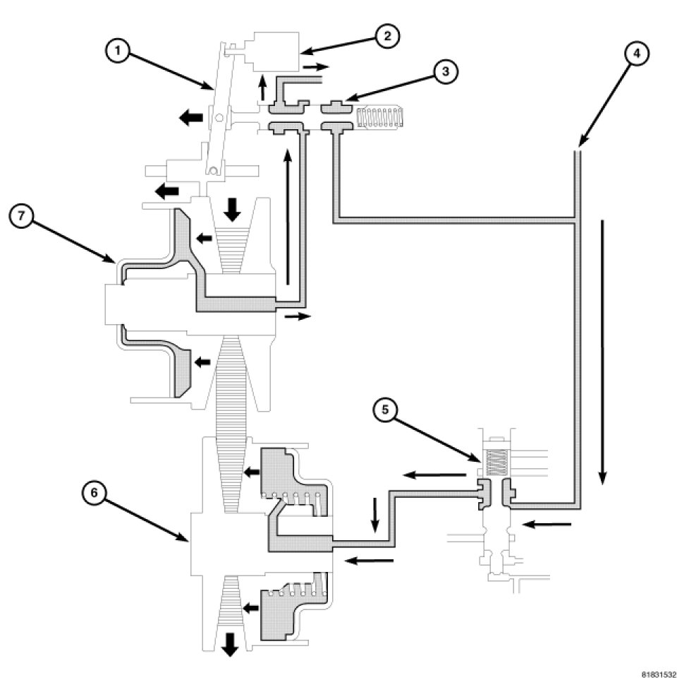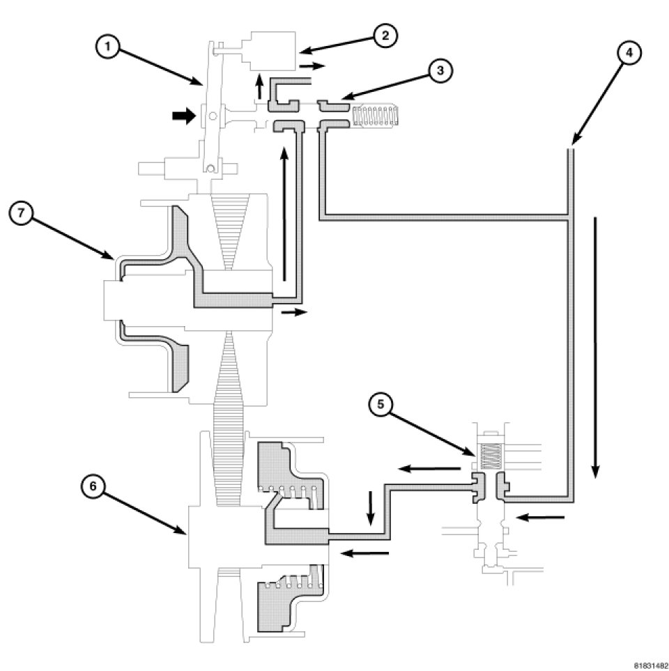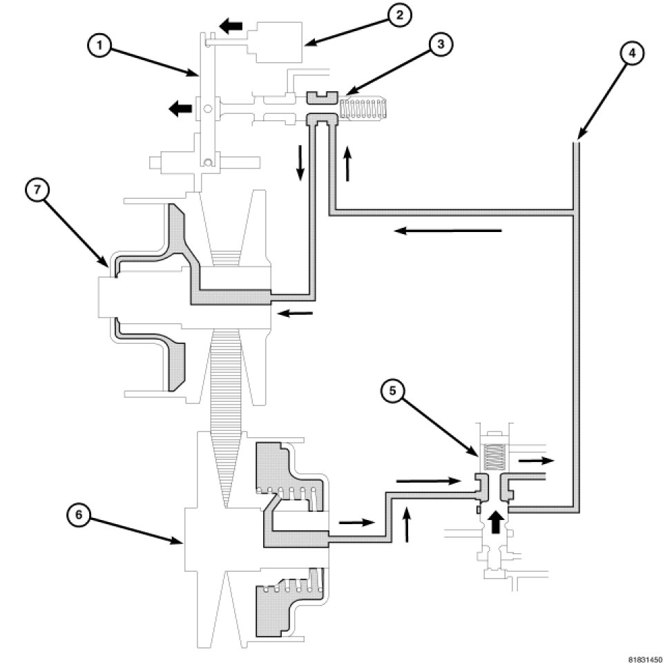 Additionally, the sliding element of the primary pulley moves to the right direction and the ratio control valve also moves to the right side and closes the line pressure circuit; this is a completion of the shift.