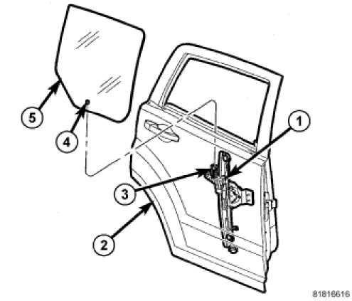 Remove fasteners, wire connectors and remove window regulator (1) from door panel.