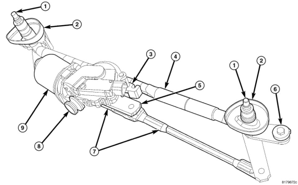 - Linkage - Two stamped steel drive links (7) connect the wiper motor crank arm to the two wiper pivot lever arms. The passenger side link has a plastic socket-type bushing on each end, while the driver side link has a socket-type bushing on the pivot end and a sleeve-type bushing on the crank arm end. The bushing on the pivot end of each link is snap-fit over a ball stud on the pivot lever arm. The sleeve-type bushing on the driver side link is snap fit over the inner ball formation of a double ball stud on the crank arm, then the socket-type bushing of the passenger side drive link is snapped over the outer ball formation.