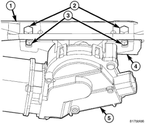 1. Position the front wiper motor and crank arm unit (5) to the underside of the front wiper module bracket (1).