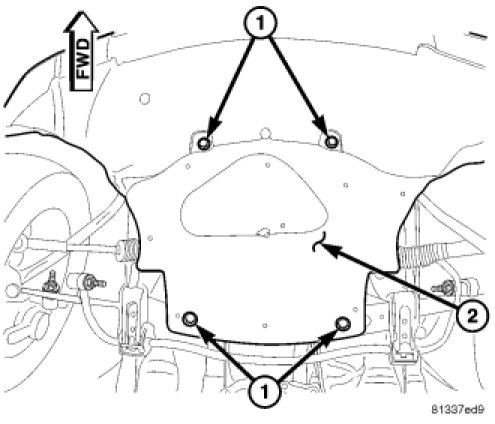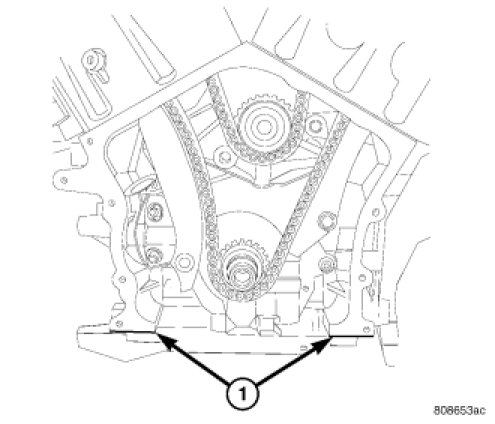 2. Before installing timing cover gasket apply a 1/8 inch bead of Mopar(R) Engine RTV GEN II to the parting lines between the oil pan and cylinder block (1).
