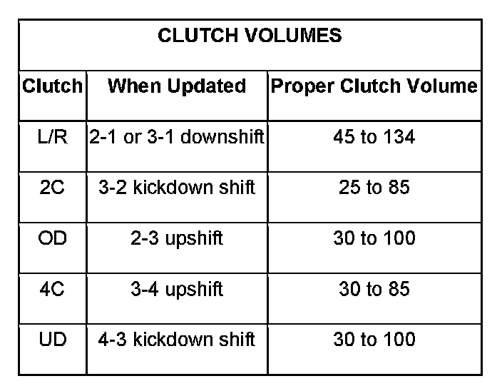Certain mechanical problems within the input clutch assembly can cause inadequate or out-of-range element volumes. Also, defective Input/Output Speed Sensors and wiring can cause these conditions. The following chart identifies the appropriate clutch volumes and when they are monitored/updated: