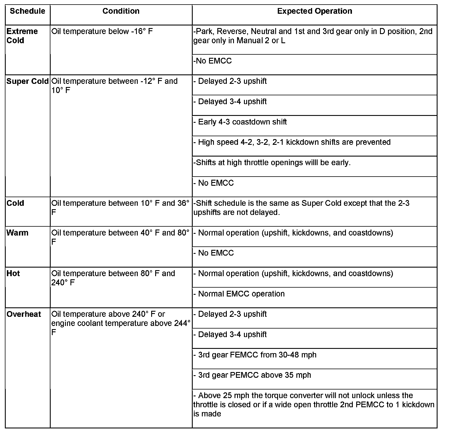 As driving conditions change, the TCM appropriately adjusts the shift schedule. Refer to the following chart to determine the appropriate operation expected, depending on driving conditions.