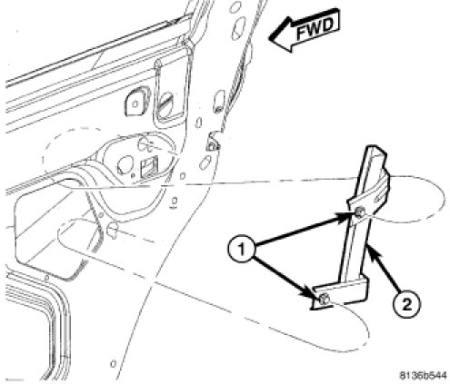 1. Position the rear door glass channel and bracket (2) into the interior of the rear door.