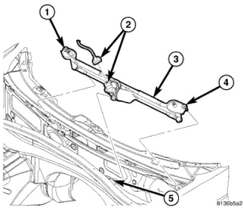 2. While positioning the wiper module in its mounting location, make sure that the dowel on the bottom of the wiper motor (1) slides into the mounting grommet (2) correctly.
