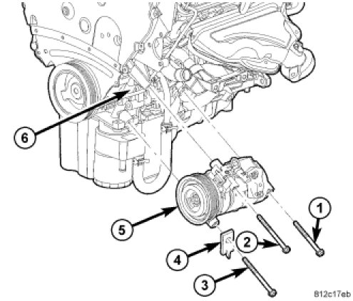 4. Tighten all three bolts that secure the A/C compressor to the engine in the following order to 26 Nm (19 ft. lbs.):