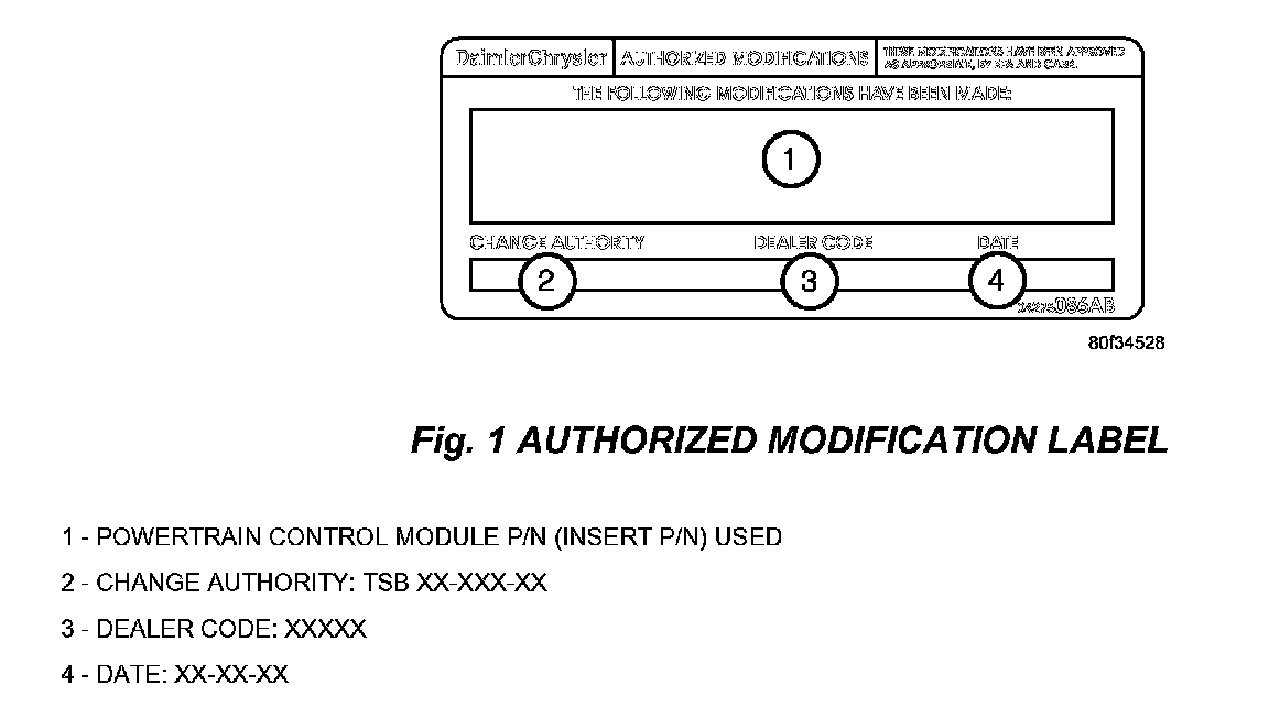 6. Type the necessary information on the "Authorized Modification Label" p/n 04275086AB and attach near the VECI label (Fig. 1).
