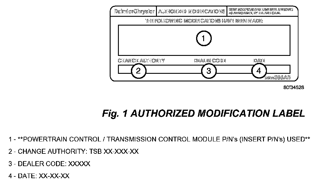 6. Type the necessary information on the "Authorized Modification Label" p/n 04275086AB and attach near the VECI label (Fig. 1).