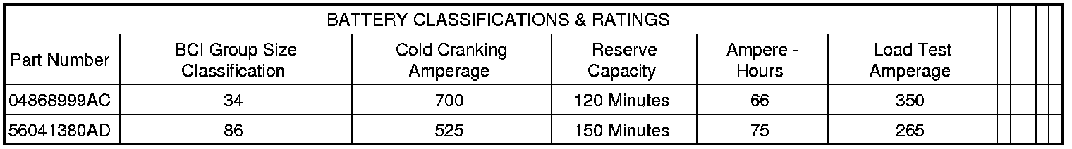 NOTE: Vehicles equipped with a diesel engine utilize a unique battery. The specifications for this battery may differ from the standards shown here. Refer to the battery manufacturer for detailed specifications.
