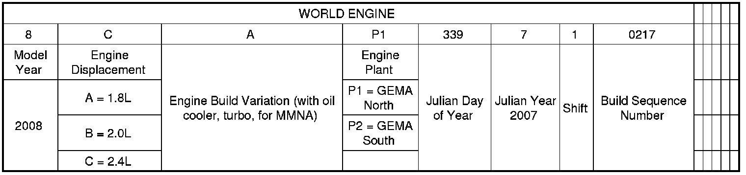and the bellhousing. The serial number contains engine build date, build location, and displacement.