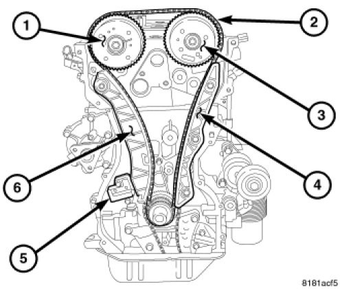 The timing chain tensioner is installed in the right side of the engine block. Using engine oil pressure, the tensioner applies constant pressure to the right side (movable) timing chain guide, which in turn applies pressure to the timing chain. Also as the tensioner extends, it rachet locks in position to provide constant timing chain tension.