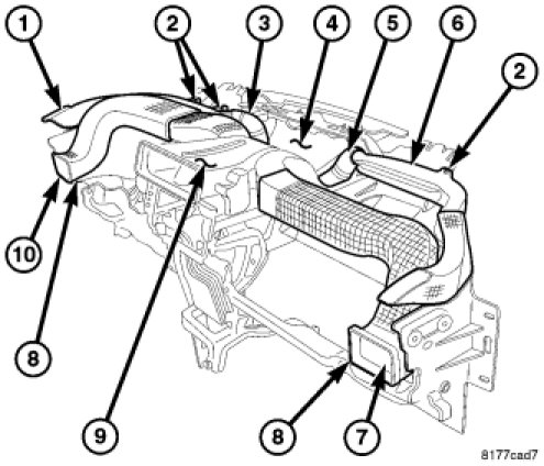 1. Position the left and right side instrument panel ducts (7 and 10) and the left and right side demister ducts (1 and 6) onto the top of the instrument panel as assemblies.