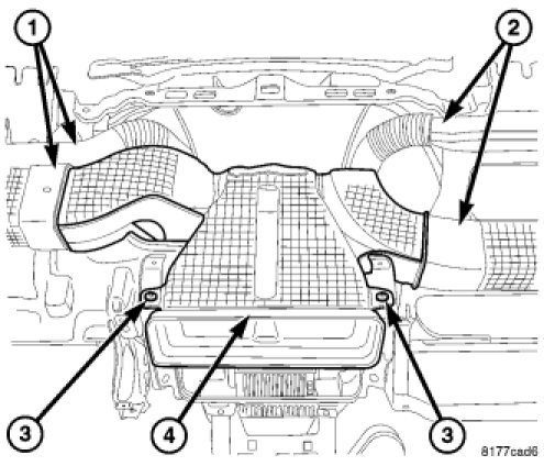 8. Install the two screws (3) that secure the center duct to the instrument panel support. Tighten the screws to 2.2 Nm (20 in. lbs.).