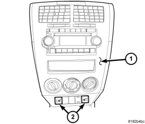 The heated seat switches are located in the center stack (1) of the instrument panel. The switches are located on the outer edges of the accessory switch bank (2). If either of the switches is damaged or inoperative the complete accessory switch bank assembly must be replaced.