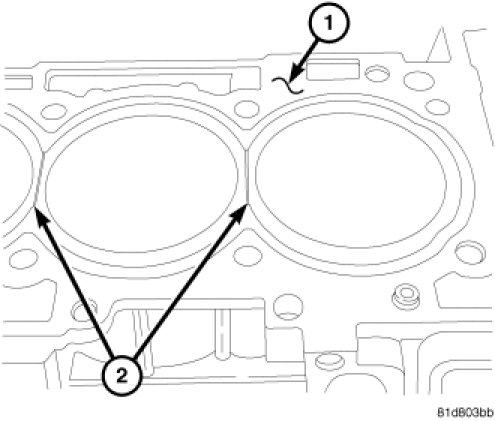 On Turbocharged blocks (1), make sure the saw cuts (2) are cleaned out or head gasket failure could occur.