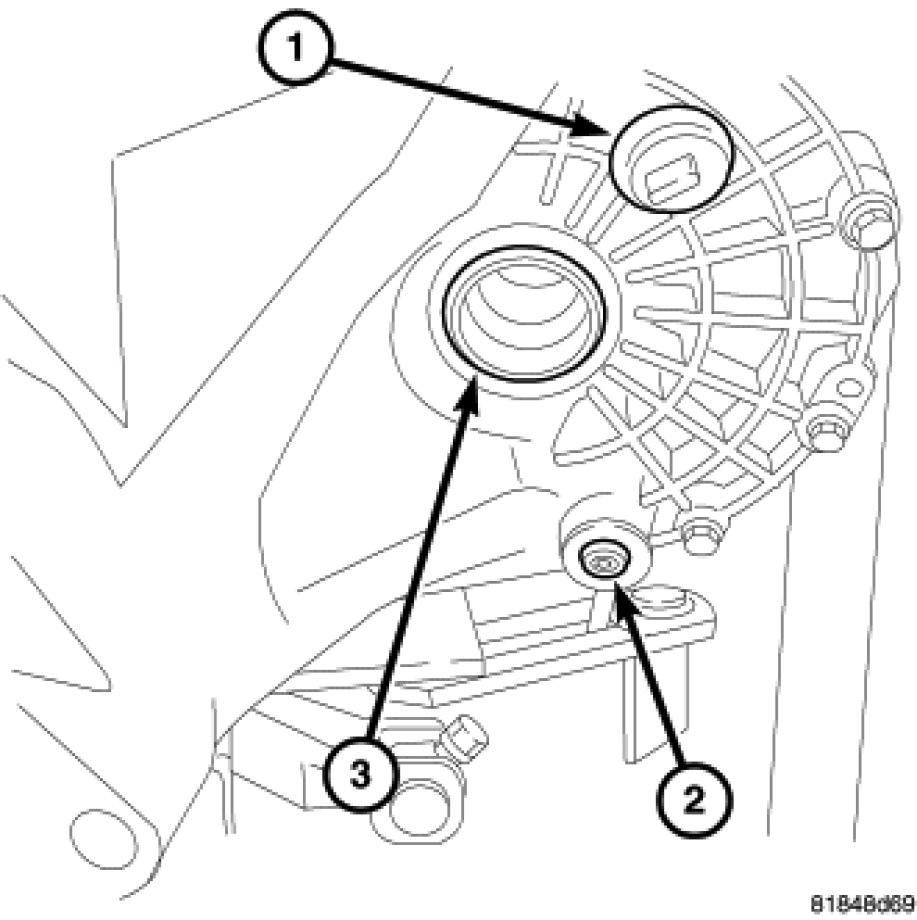 The transaxle fill plug (1) is located on the left side of the transaxle differential area. The fluid level should be within 3/16 inch from the bottom of the transaxle fill hole (vehicle must be level when checking).