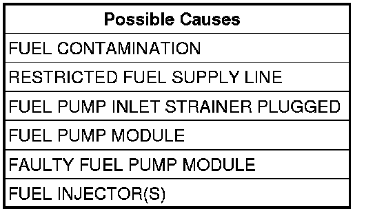 Remove the Fuel Pump Module and Fuel Tank Module (if equipped), inspect the Fuel Pump Inlet and the bottom of the fuel tank for debris that could cause the fuel pump inlet to be plugged.