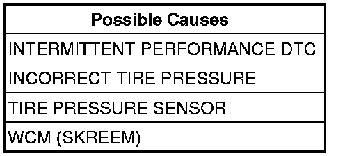 NOTE: The DTC can be caused by many different factors and might not be a sensor/transmitter or a WCM (SKREEM) fault. Interference from other elements will over power the sensor/transmitter RF frequency making erratic operation to the TPM system. Check the vehicle for aftermarket accessories that could compromise the RF frequency signal before diagnosing the TPM system.