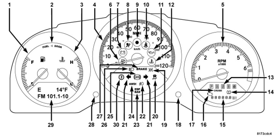 4. A long (longer than two seconds) STEP button press will place the compass in calibration mode. The "Cal" indicator will change from flashing to on continuously in the EVIC display (29) to indicate that the compass is now in the calibration mode and that the vehicle can now be driven to calibrate. (A short STEP button press from the "Calibrate Compass (Yes)" screen will exit the EVIC Customer Programmable features, and return it to its normal operating mode).