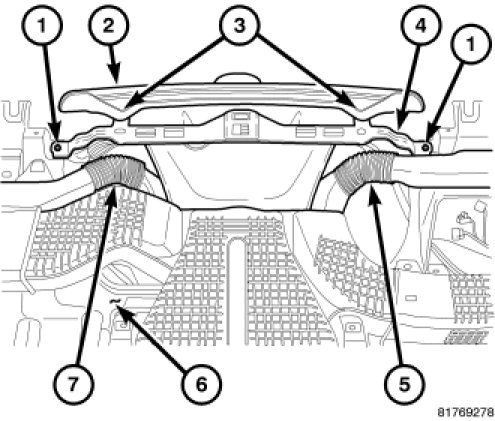 1. Position the defroster duct (2) to the front of the instrument panel (6).