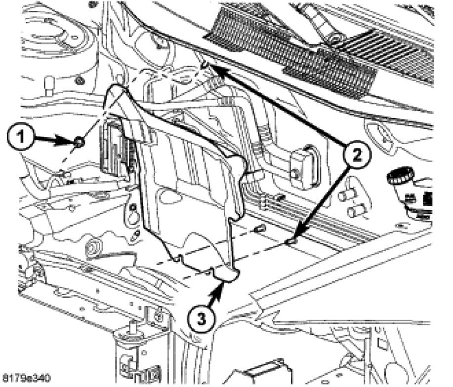 9. Position the heat shield (3) onto the studs (2) located on the dash panel in the engine compartment.
