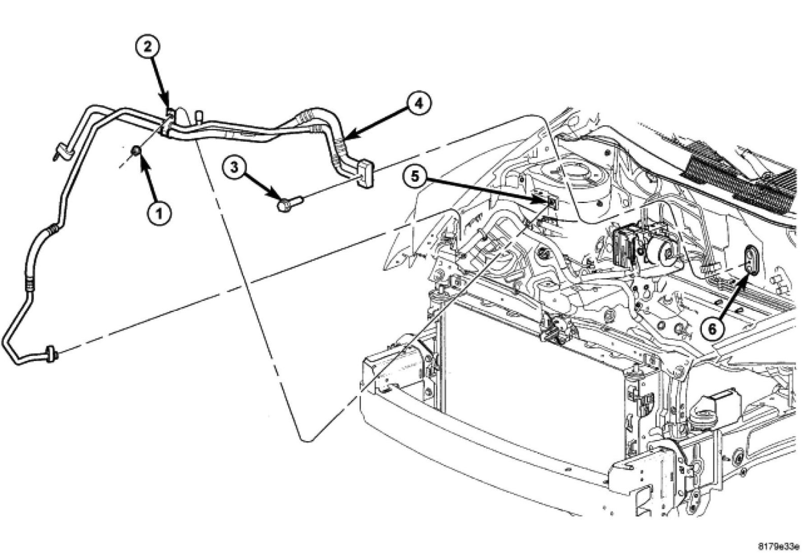 5. Install the bolt (3) that secures the A/C liquid and suction line assembly to the A/C evaporator. Tighten the bolt to 12 Nm (105 in. lbs.).