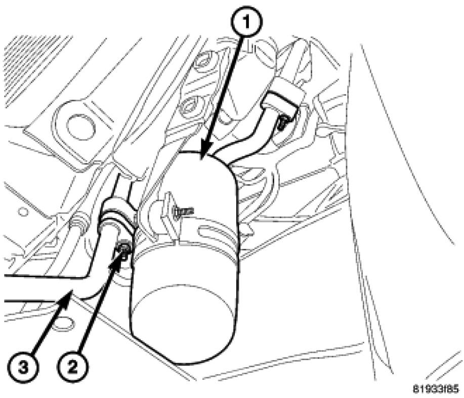 14. Reach up through the opening in the bottom of the front fascia and connect the A/C liquid line (1) to the A/C condenser (2) and install the retaining nut (3). Tighten the nut to 5 Nm (44 in. lbs.).
