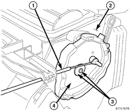 9. Install the blend door pivot lever (3) onto the end of the blend door pivot shaft (4) located on the left side of the air distribution housing (2). Make sure the lever retaining tab is fully engaged to the pivot shaft.
