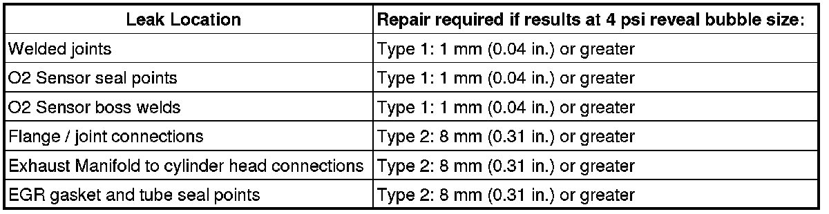 Any Type 1 or greater leaks found in welded joints, O2 sensor seal points or O2 sensor boss welds must be repaired or the component must be replaced.