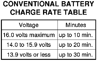 3. Battery chargers vary in the amount of voltage and current they provide. The amount of time required for a battery to accept measurable charging current at various voltages is shown in the Charge Rate Table. If the charging current is still not measurable at the end of the charging time, the battery is faulty and must be replaced. If the charging current is measurable during the charging time, the battery may be good and the charging should be completed in the normal manner.