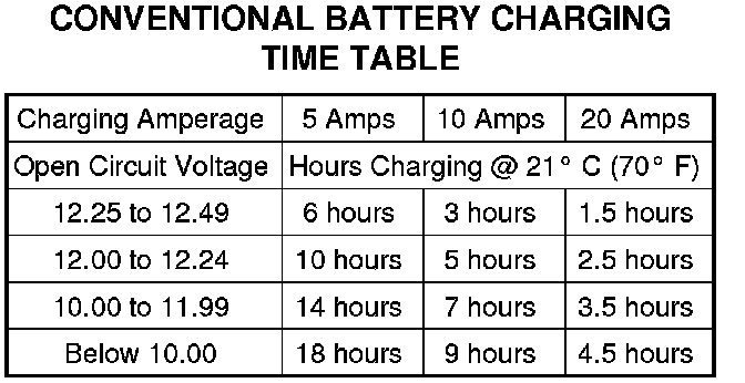 The Conventional Battery Charging Time Table gives an indication of the time required to charge a typical battery at room temperature based upon the battery state-of-charge and the charger capacity.
