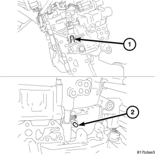 59. To install the valve body assembly on to the transaxle case, insert a 75 mm (3 in.) long 3 mm (0.118 in.) wide rod or wire into the linkage stopper hole of the valve body assembly to set the pulley ratio linkage (1) in position.
